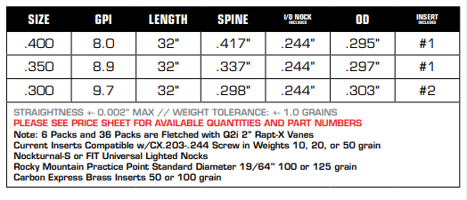 - Laser Match Set – Pack sets are sorted & matched by spine and weight for best-in-class consistency. Spine sorting tolerance +/- .0025” & Weight sorting tolerance +/- 1.0 grains