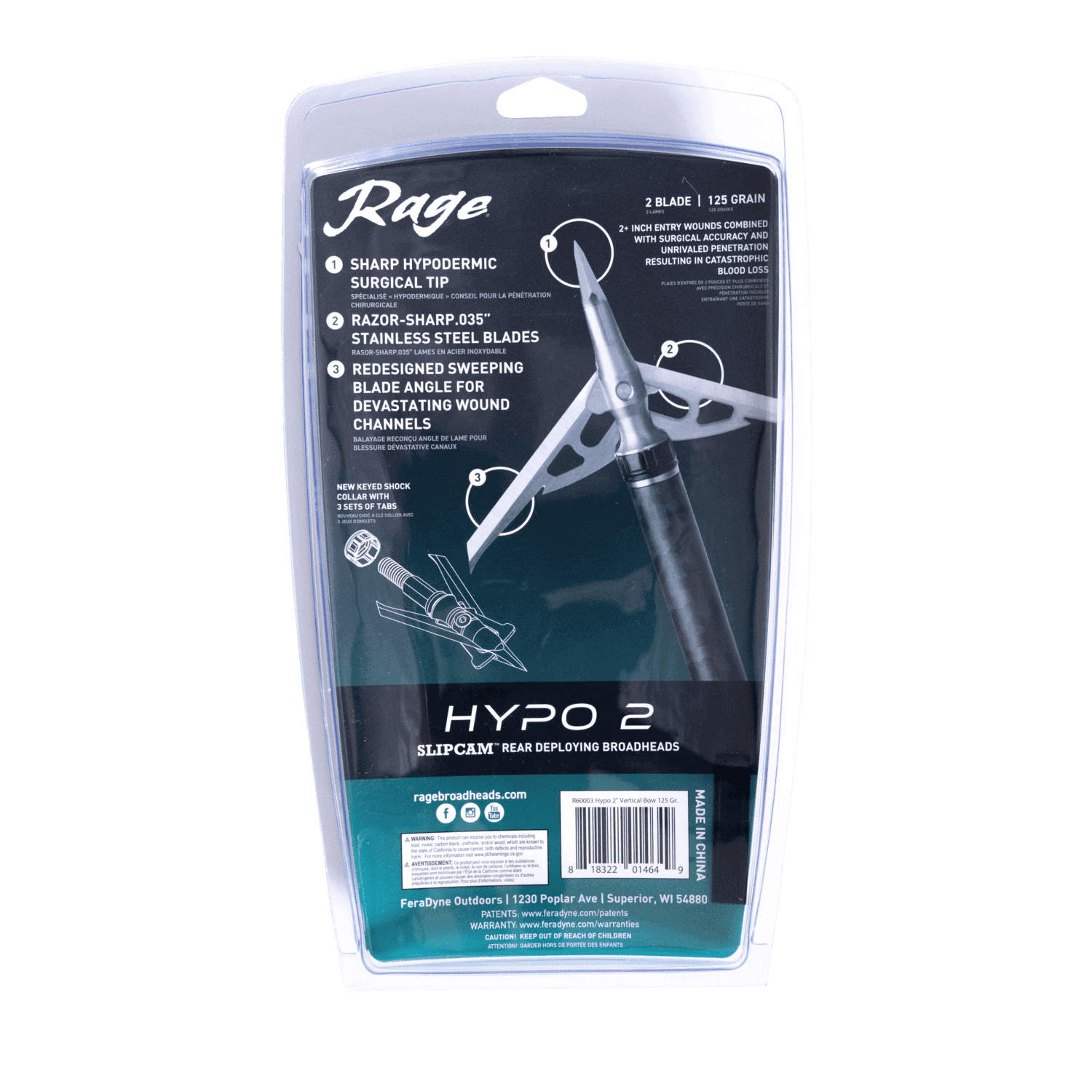 Rage Customers asked and we delivered. The Hypo 2 is an improved Shock Collar version of our original Hypodermic Series of Slip Cam Broadheads, featuring a triangular keyed shock collar that only allows the Shock Collar to be installed in the correct orientation to eliminate improper installation. Once in place the tried and true Shock Collar blade locking system holds the 2 razor sharp, .035″ stainless steel blades closed until impact. Upon impact, the blades instantly deploy to a 2+ inch cutting diameter, administering the gaping wounds that bowhunters have come to expect from the field-proven Rage Hypodermic series. The keyed Shock Collar also allows for all 6 pedals to be used; simply remove the collar, spin 120 degrees and reinstall. The Hypo 2 features an even sharper Hypodermic hybrid tip and more swept blade angle for increased penetration. In flight, that streamlined design makes for superior field-tip accuracy. The two .035” thick blades deploy on impact, sliding into a swept-back blade angle while the monstrous 2” cutting diameter delivers an extra wide “Slap Cut” entry hole for gruesome blood trails and brief tracking jobs. Available in 100 Grain and 125 Grain.